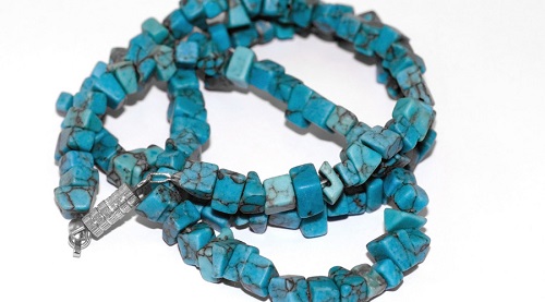 綠松石因“形似松球,色近松綠”而得名,顏色有深有淺,質(zhì)地不均,致密程度也有較大差別,它作為佩戴和使用已有5000年以上的歷史。綠松石的產(chǎn)地很多,以湖北鄖縣、鄖西、竹山一帶的優(yōu)質(zhì)綠松石世界著名,其中鄖西的鄖西菜籽黃最具特色,玉石中含鋅,全世界只有中國(guó)湖北和美國(guó)內(nèi)華達(dá)州有產(chǎn)出。